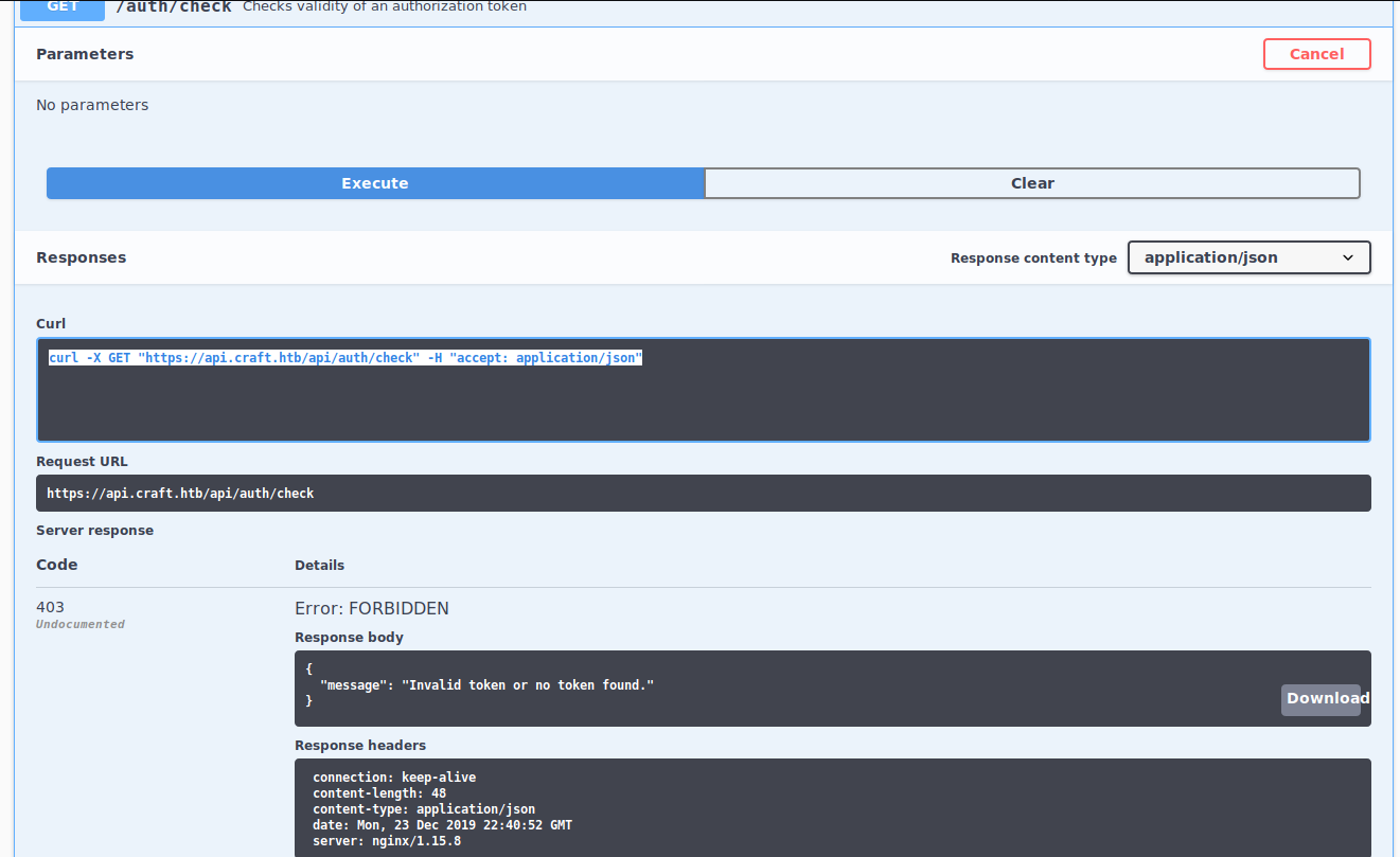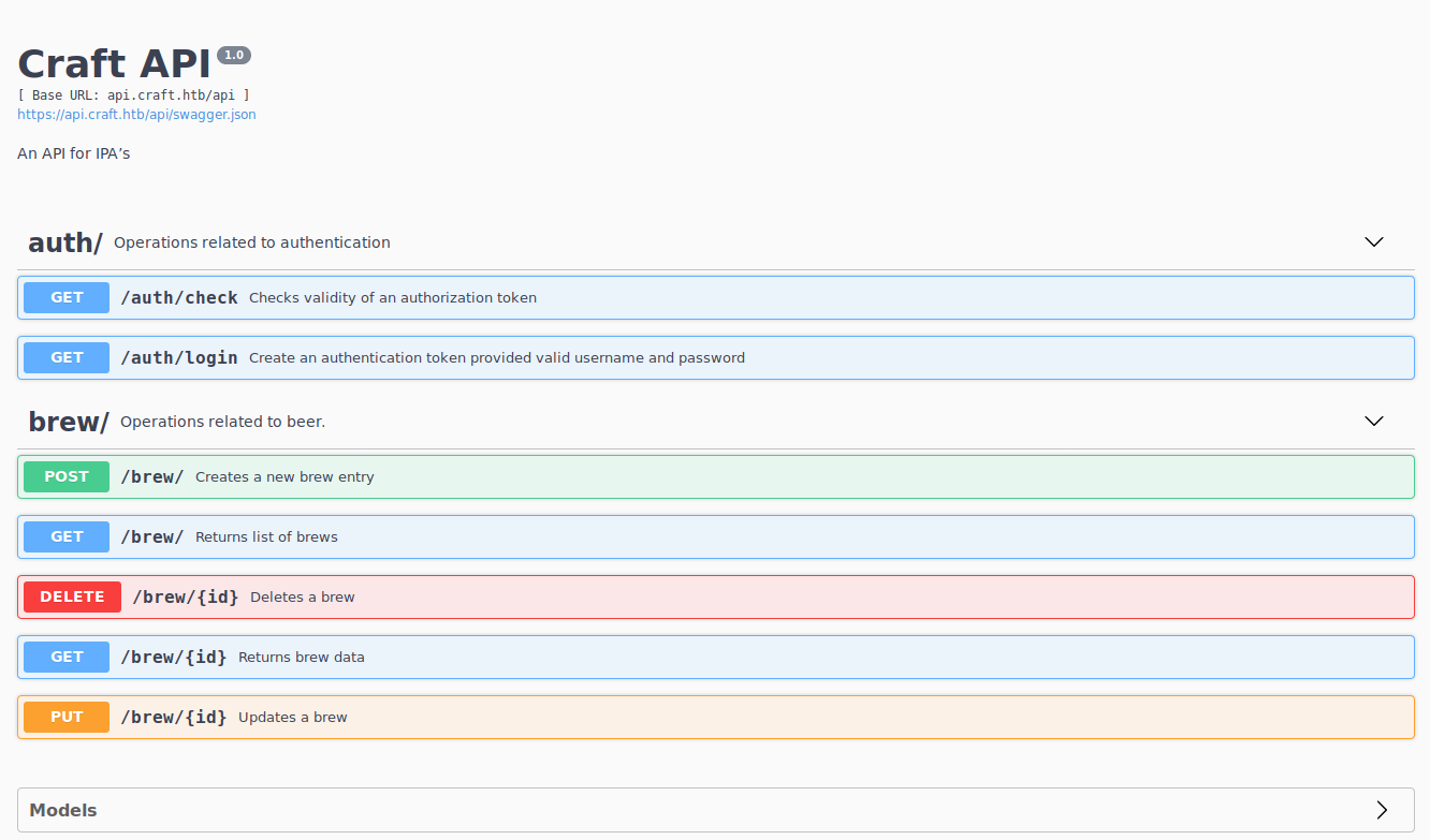 Afterwards, we jump into https://api.craft.htb and we can see the endpoints and how to interact with them.