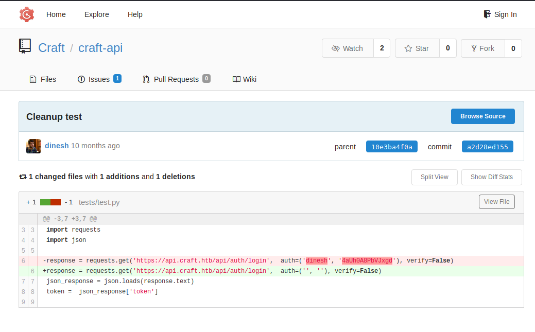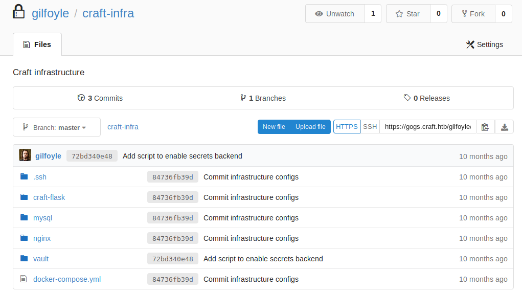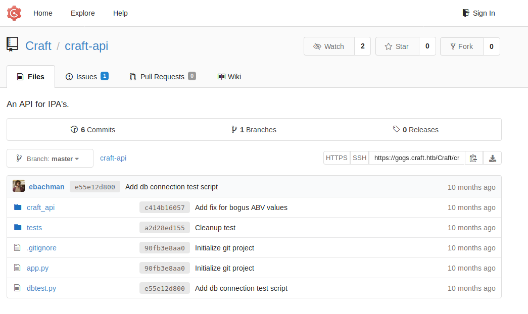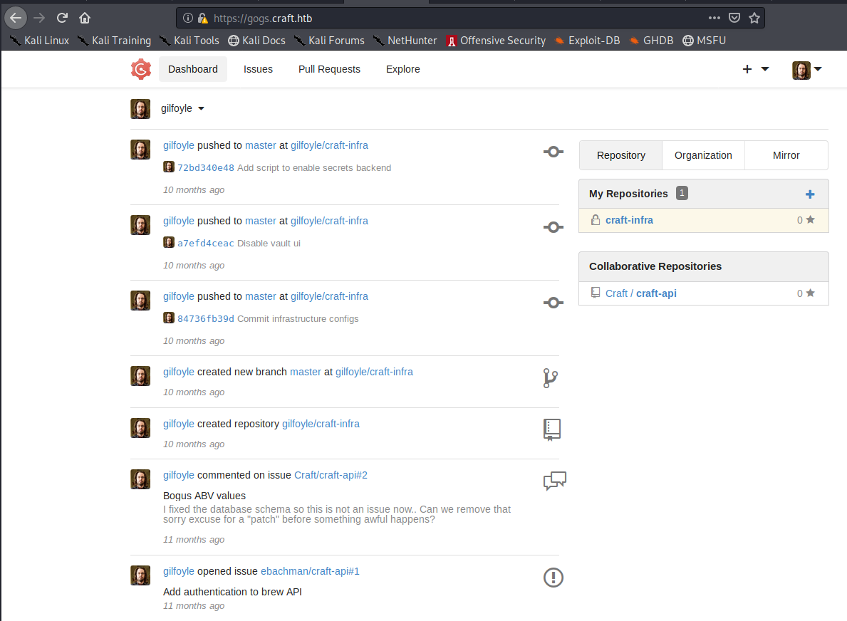 We don’t have at the moment any credentials to identify, so we go to https://gogs.craft.htb in order to see if we can find something.