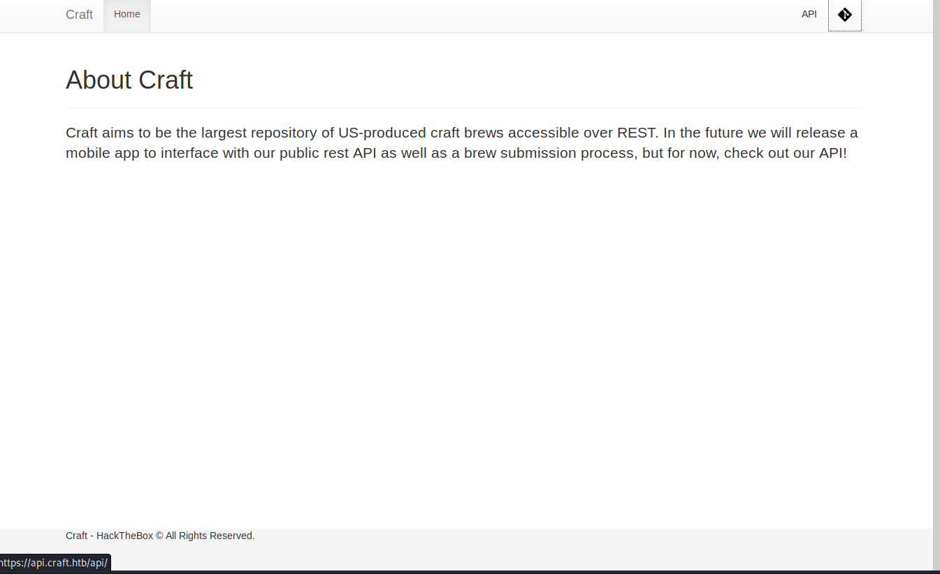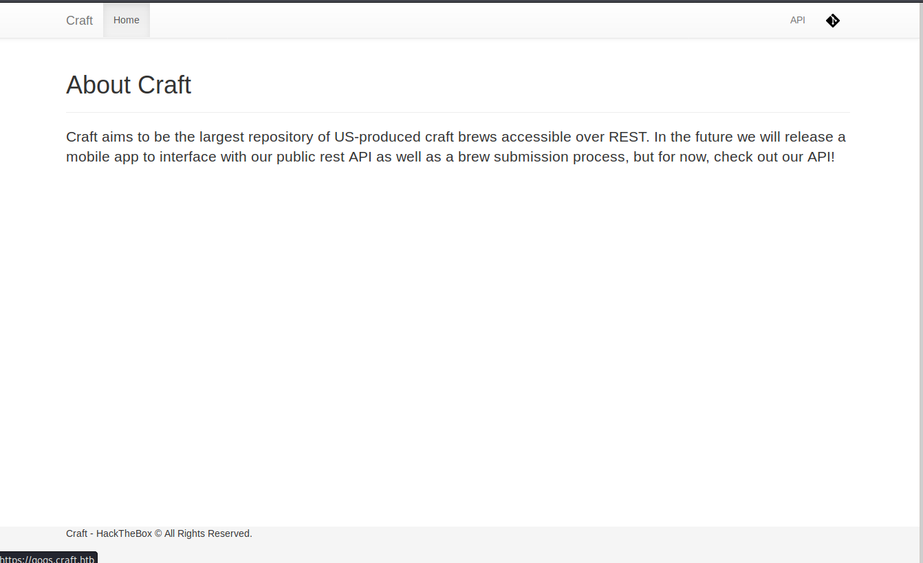 The home page is kind-empty, but if we position the cursor on API and the Github logo, we see at the bottom that it will redirect to https://api.craft.htb and https://gogs.craft.htb, we will add them to /etc/hosts pointing to the IP of craft 10.10.10.110.