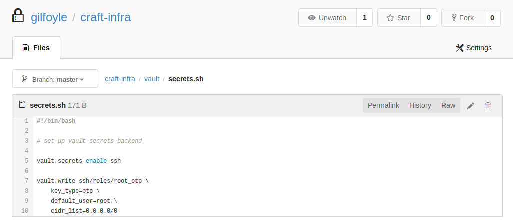 We go back to the repo of craft-infra inside the vault folder to see if we can find the secret stored, in it is a small script secrets.sh which has exactly what we need: