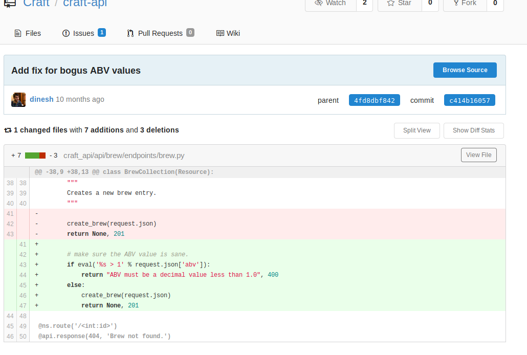 Now with credentials, knowing we could take advantage of the eval() and remembering the curl Denish was using in his issue + the API, we can make an injection via a POST to /api/brew/.