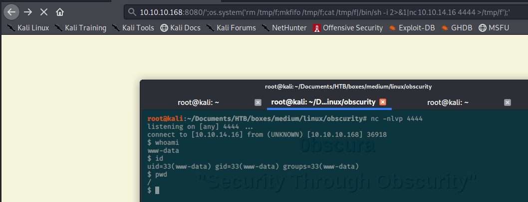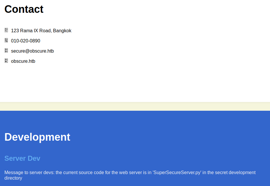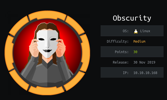 Well, Obscurity is a Linux medium machine, mostly using Python stuff and as the name says before hand, the concept in this one is security by obscurity, so it doesn’t use standard web servers and so on, instead it use custom stuff in order to “provide security” by there being not public ways to exploit it, so you are forced to do some code review, think outside the box, etc.
